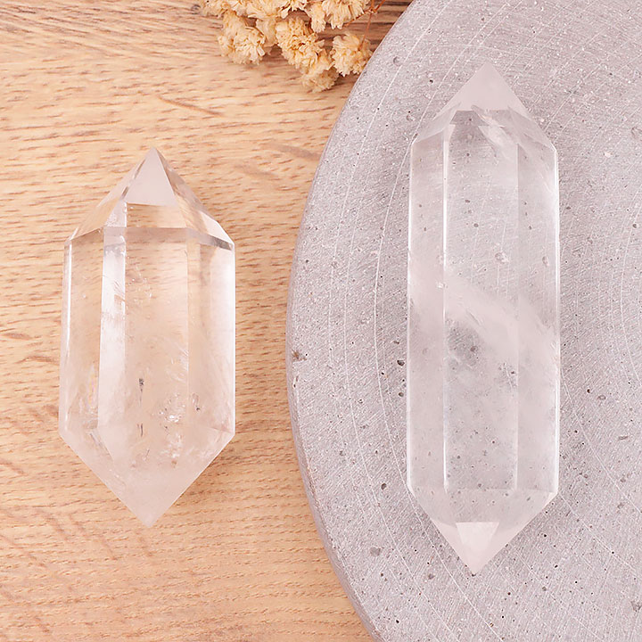 Armbänder und Anhänger aus Bergkristall. Perlen, Trommelsteine und Bergkristallspitzen.
