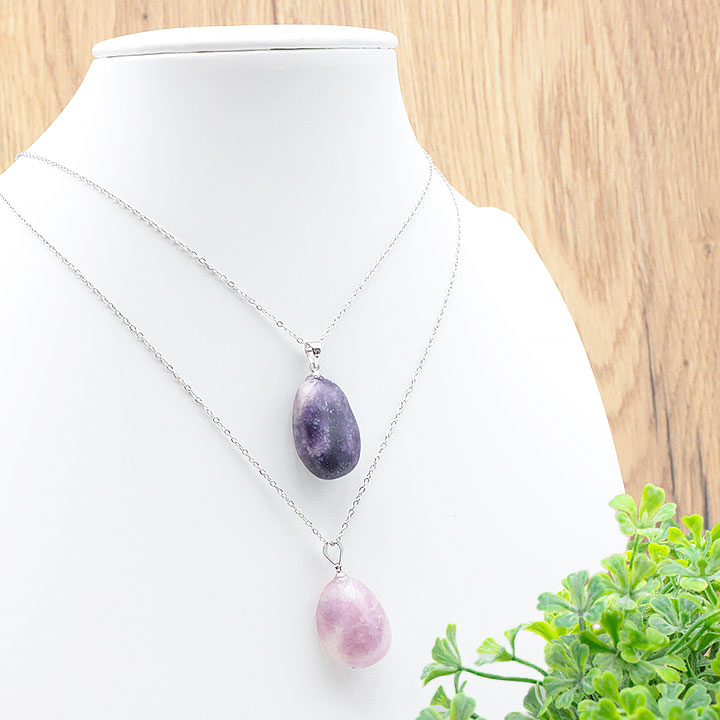 Armbänder und Anhänger aus Lepidolith. Kieselsteine und durchbohrte Steine aus Lepidolith.