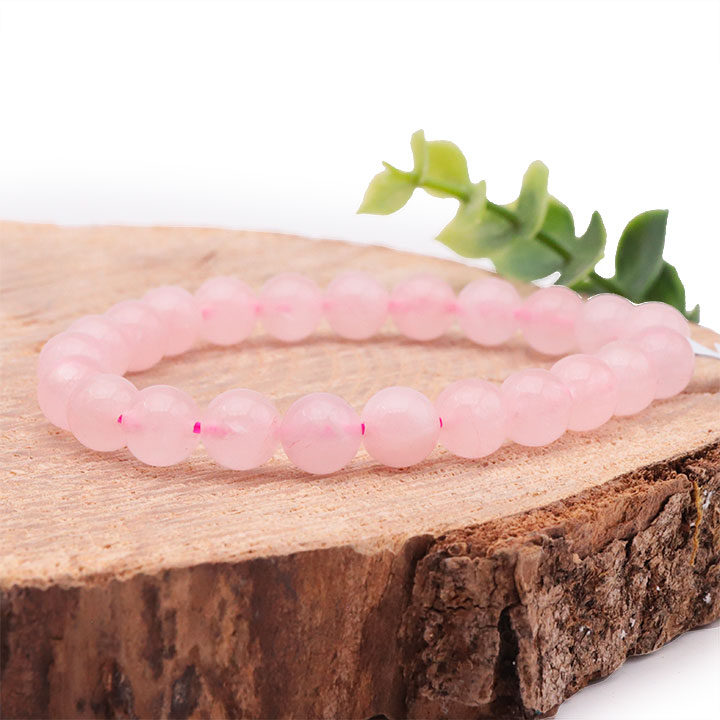 Armbänder und Anhänger aus Rosenquarz. Kieselsteine, Rohsteine und Trommelsteine aus Rosenquarz. Aus Rosenquarz geschnitzte Figuren.