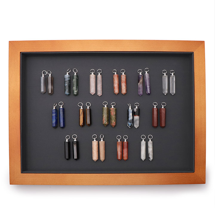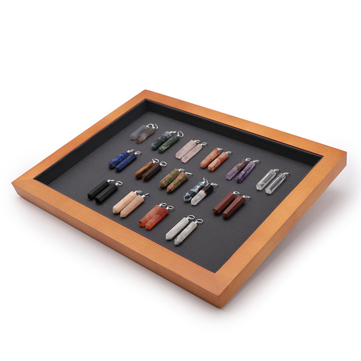 Dieser Display kann Anhänger, Armbänder, Trommelsteine usw. enthalten ...
